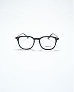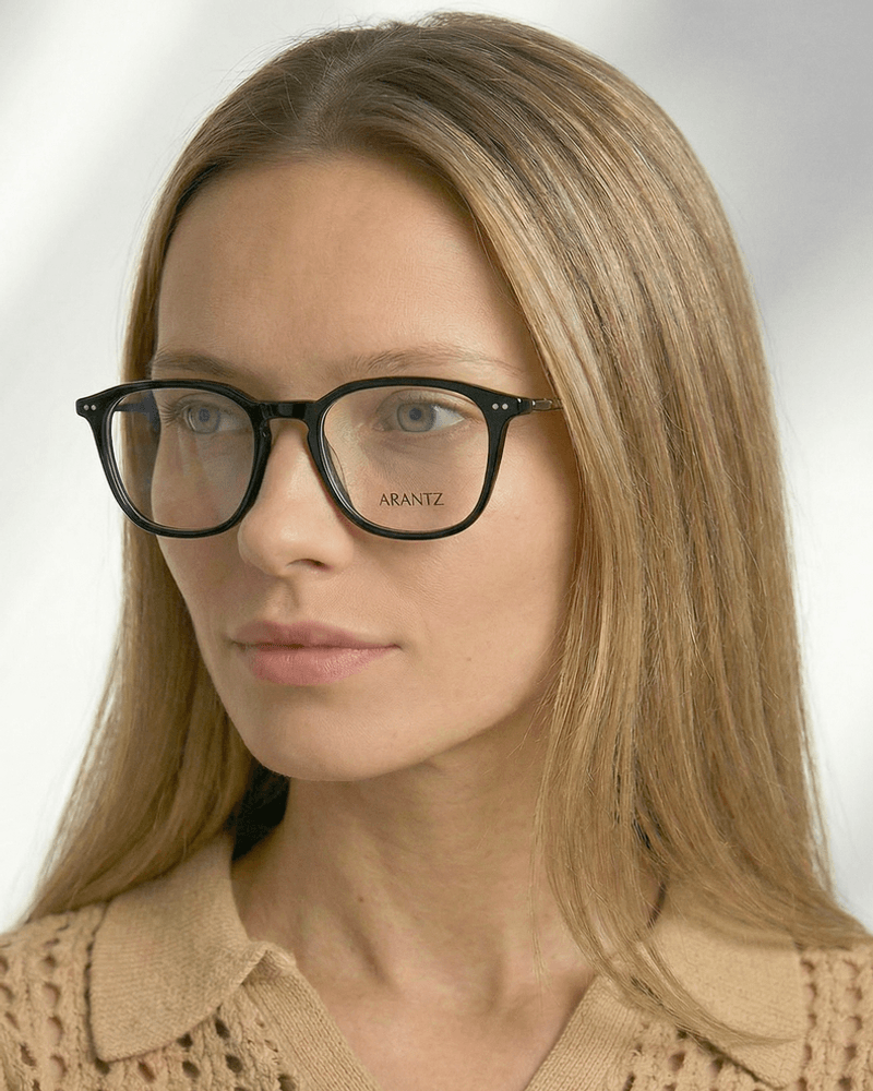 O aro possui espessura equilibrada, conferindo estrutura e conforto visual, enquanto o formato levemente arredondado das lentes favorece harmonia e adaptação ao rosto. Os rebites frontais adicionam um detalhe sutil de caráter, reforçando a identidade do modelo sem interferir na sua sobriedade.