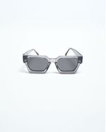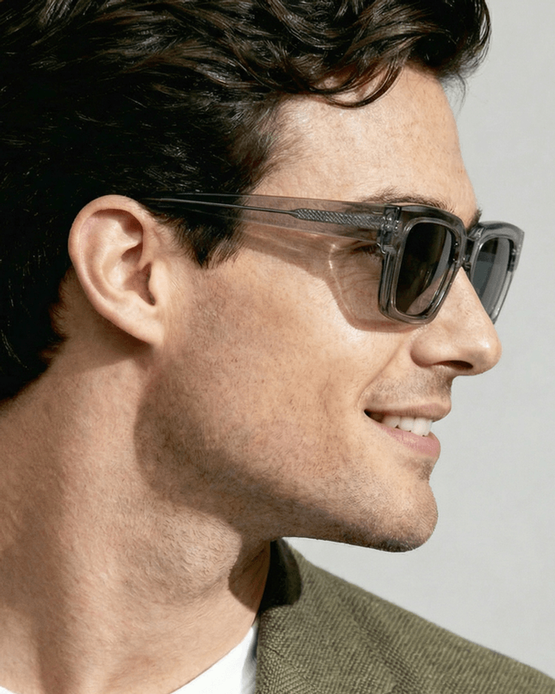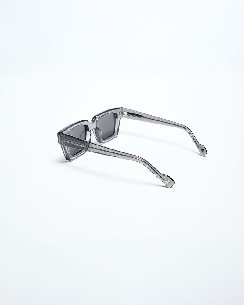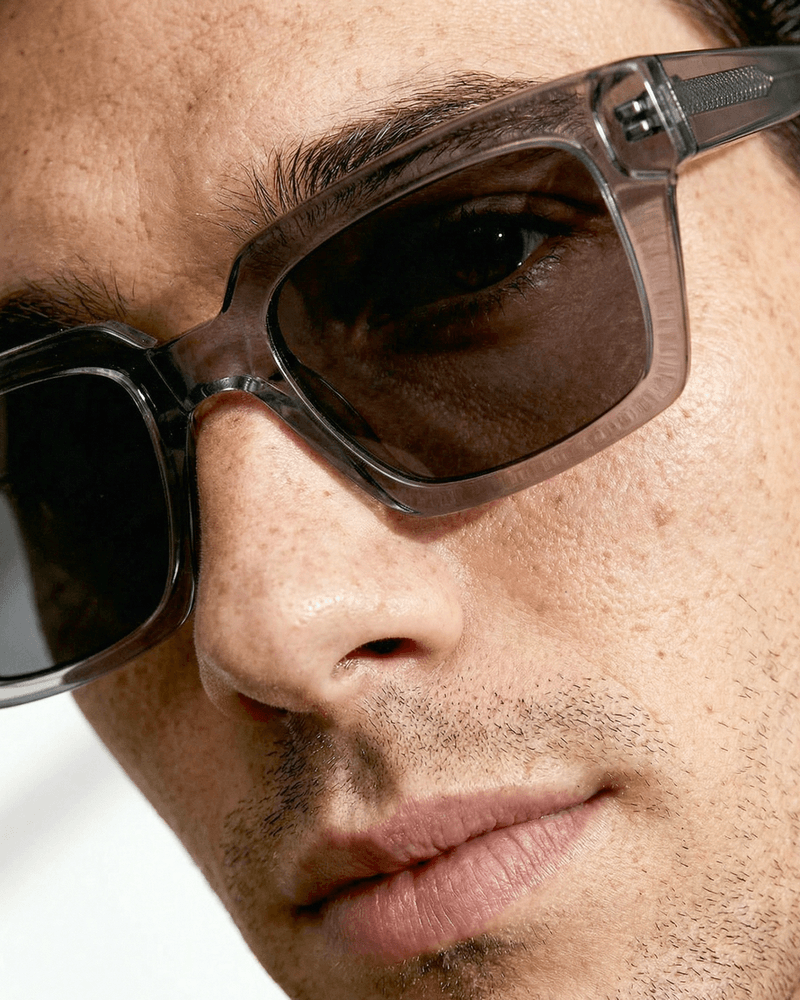 O aro possui espessura sólida, transmitindo sensação de estrutura e durabilidade, enquanto o formato levemente retangular das lentes reforça o caráter assertivo do modelo. O desenho da ponte integra o conjunto com precisão, garantindo equilíbrio visual e conforto no encaixe.