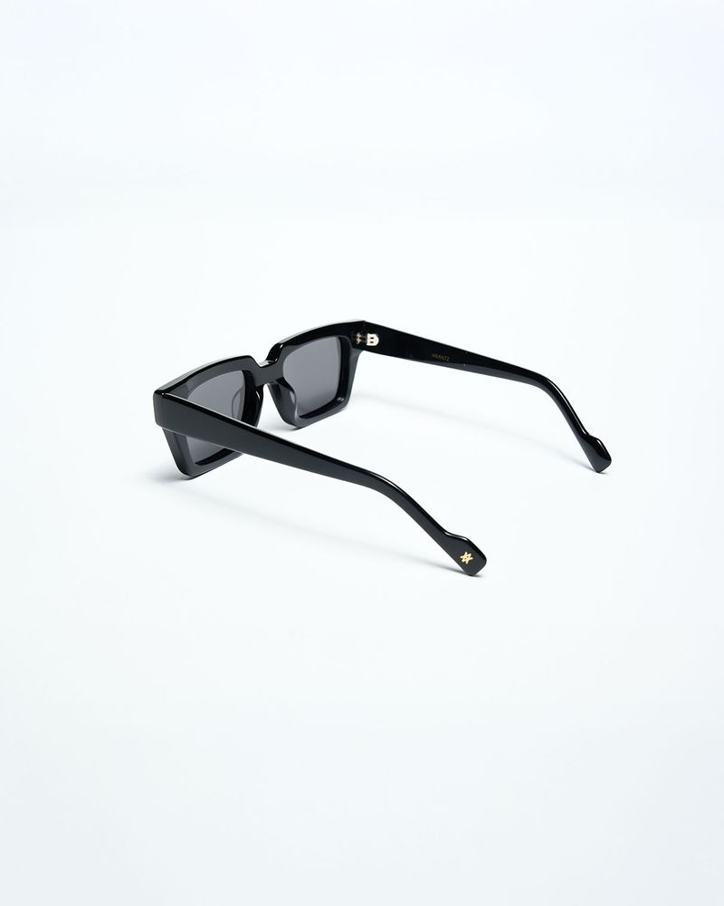 O aro possui espessura sólida, transmitindo sensação de estrutura e durabilidade, enquanto o formato levemente retangular das lentes reforça o caráter assertivo do modelo. O desenho da ponte integra o conjunto com precisão, garantindo equilíbrio visual e conforto no encaixe.
