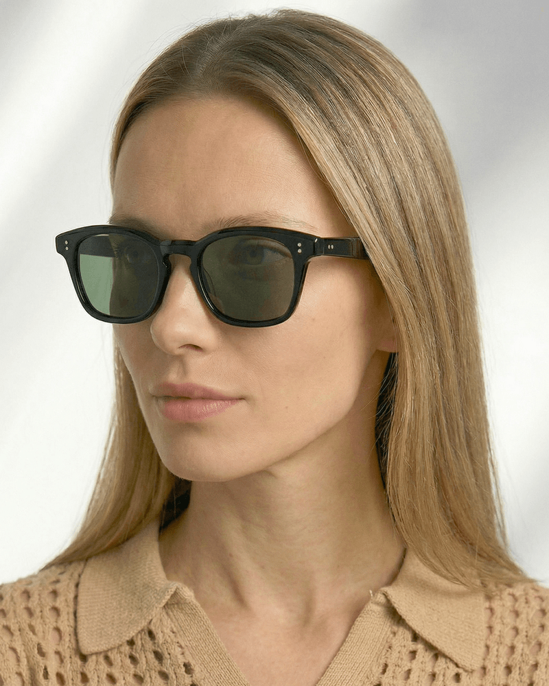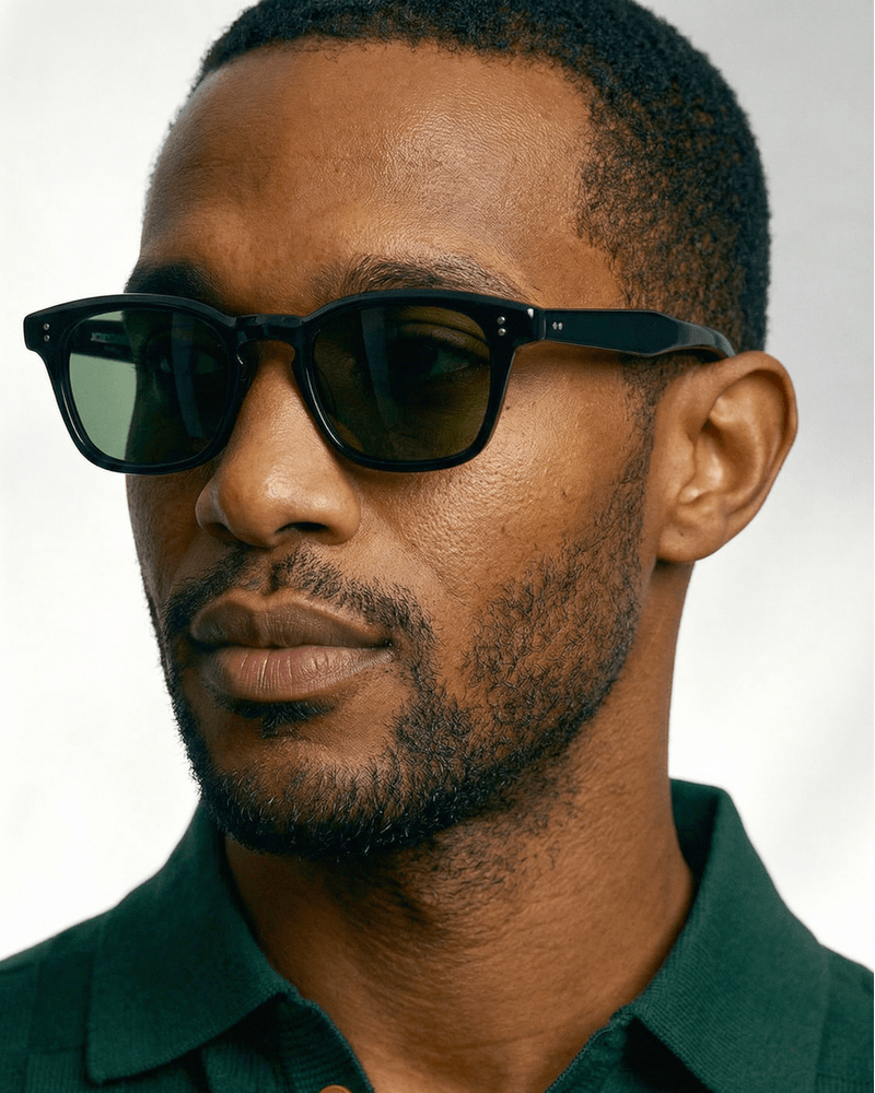 A armação apresenta um formato retangular suavemente arredondado, com proporções equilibradas que emolduram o olhar de forma natural e confortável. A frente sólida transmite estabilidade visual, com detalhes discretos que reforçam sua identidade clássica.