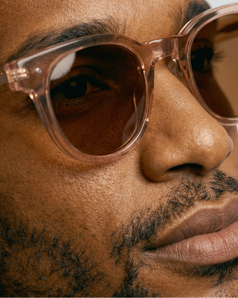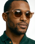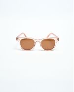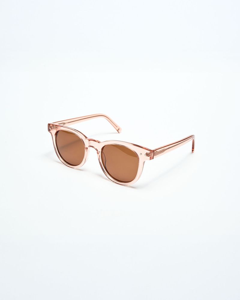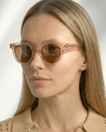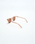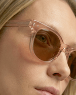 O aro possui espessura delicada, valorizando o acabamento translúcido e a sensação de leveza visual. As lentes de formato arredondado reforçam a fluidez do desenho, enquanto a tonalidade suave acrescenta calor e sofisticação ao conjunto, criando um contraste elegante e acolhedor.