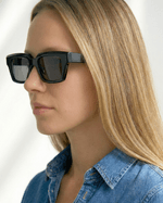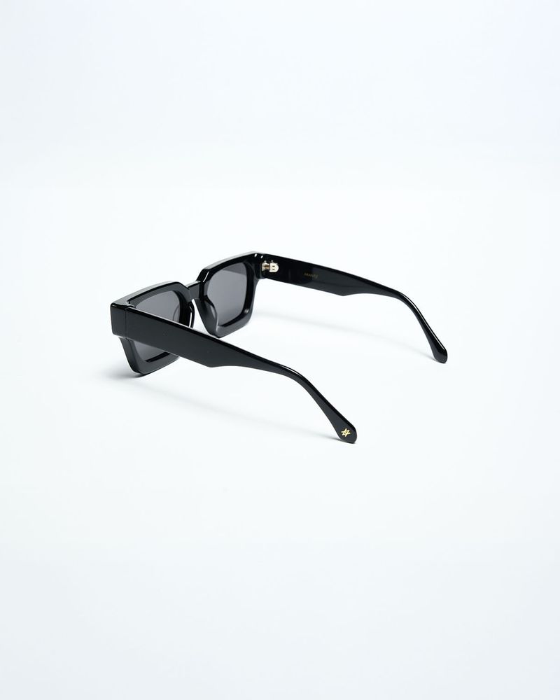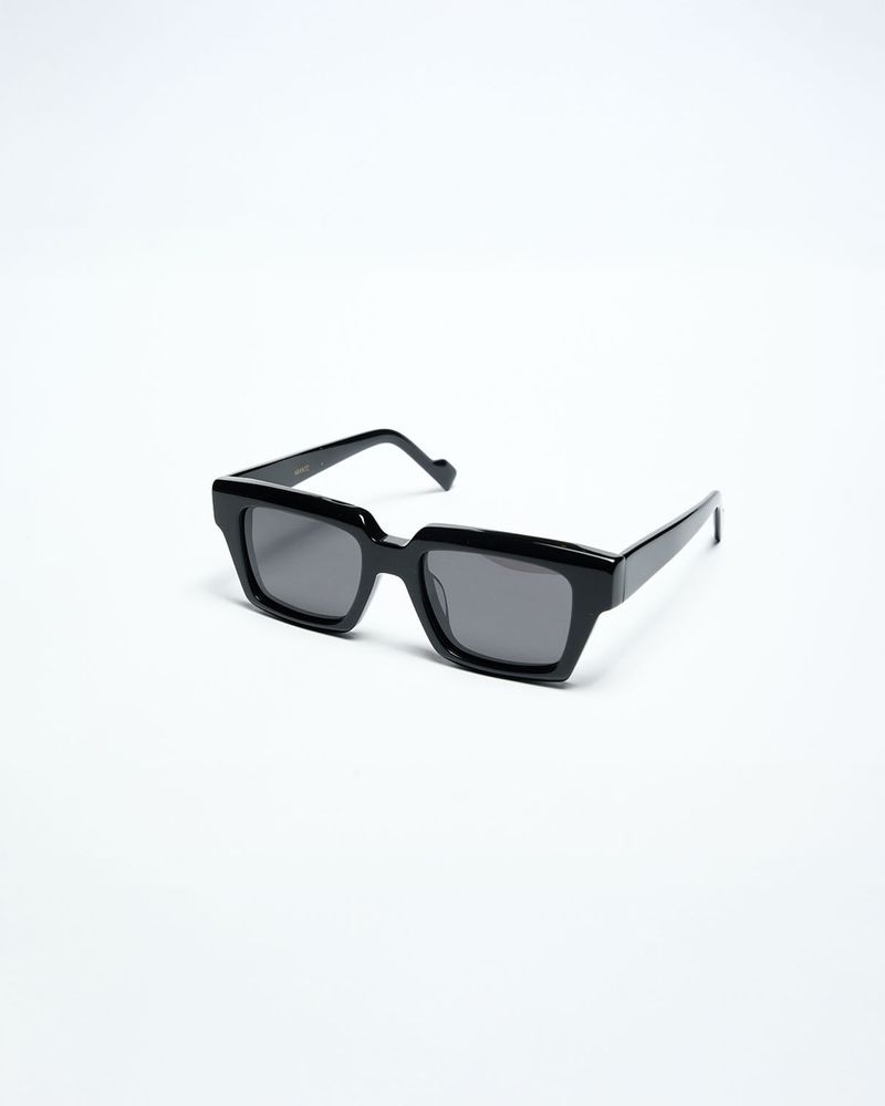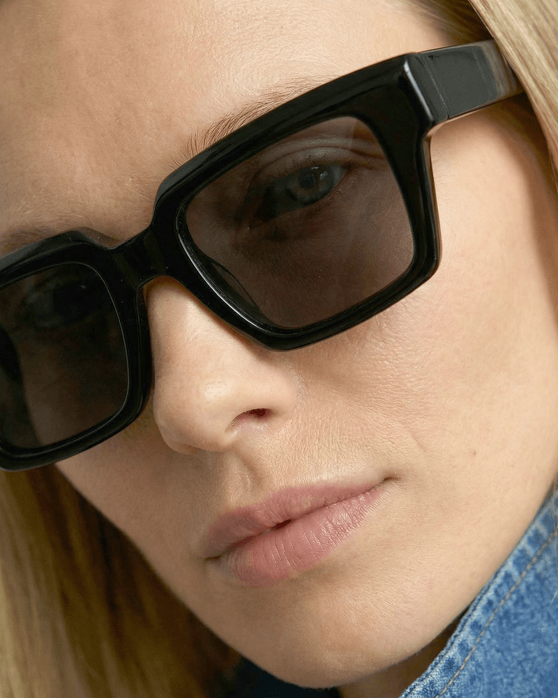 A armação apresenta um formato geométrico equilibrado, com ângulos sutis e proporções amplas que estruturam o olhar de maneira segura e expressiva. O acabamento translúcido reforça a sensação de leveza visual e profundidade material, enquanto as lentes escuras criam contraste e fortalecem sua identidade urbana e atual.