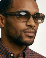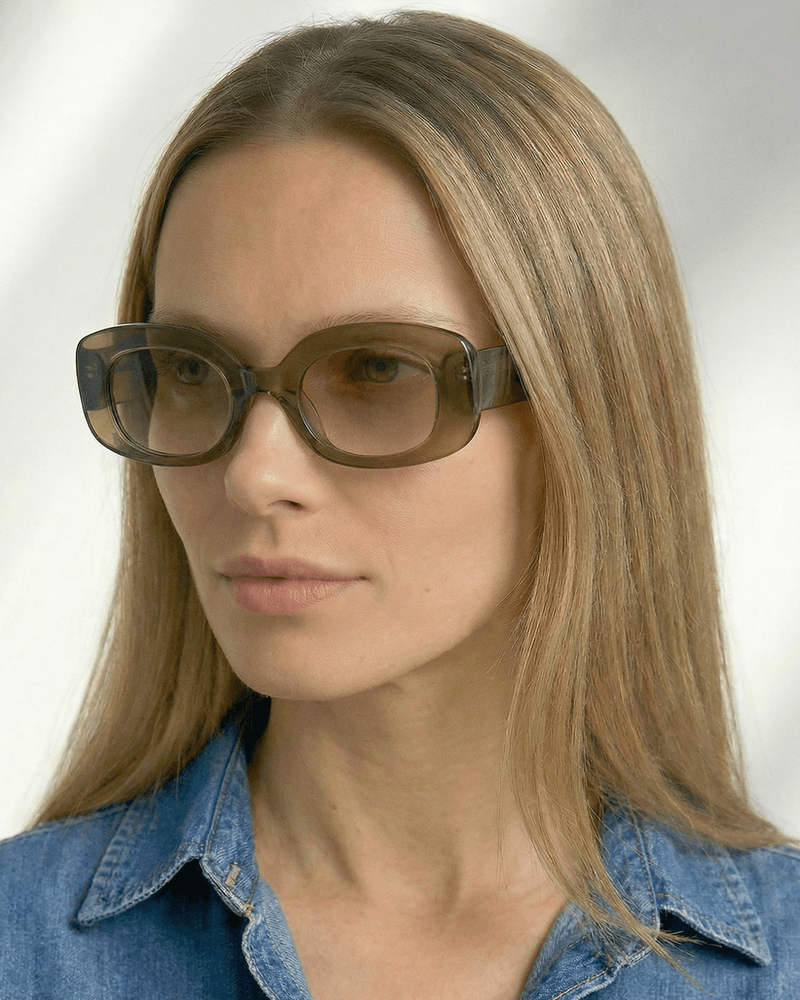 A armação se destaca pelo formato retangular suavemente arredondado, com proporções generosas que emolduram o olhar de forma elegante e confortável. O volume é bem distribuído, resultando em um visual consistente e contemporâneo, enquanto as curvas suaves garantem adaptação natural ao rosto e leitura atemporal.